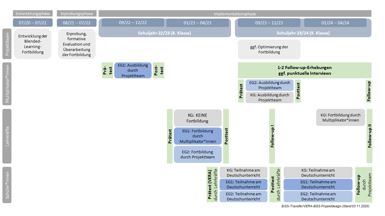 - Experimentalgruppe 2 (EG2) – naher Transfer: Die Lehrkräfte eines Verbundes werden direkt durch das Projektteam im Schuljahr 2022/23 fortgebildet (1/2023 – 4/2023) und bei der Ergebnisnutzung von VERA-8 im laufenden (8. Klasse) und im folgenden Schuljahr (9. Klasse) begleitet. Multiplikator*innen dieser Verbünde werden im Verlauf der Implementationsphase (09/2023-12/2023) qualifiziert.