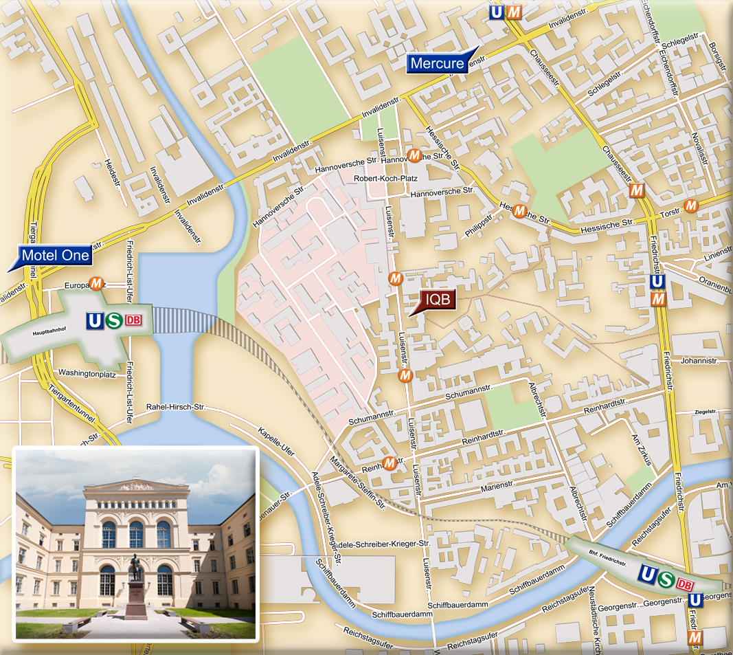 Leave the main station through the Washingtonplatz exit. Cross the Washingtonplatz square and turn left into Rahel-Hirsch-Straße (later Kapelle-Ufer). Cross the bridge and then turn left into Reinhardtstraße. The second crossing street is Luisenstraße, turn left. The IQB is on the right after approx. 300 metres. Walking time: approx. 15 minutes.