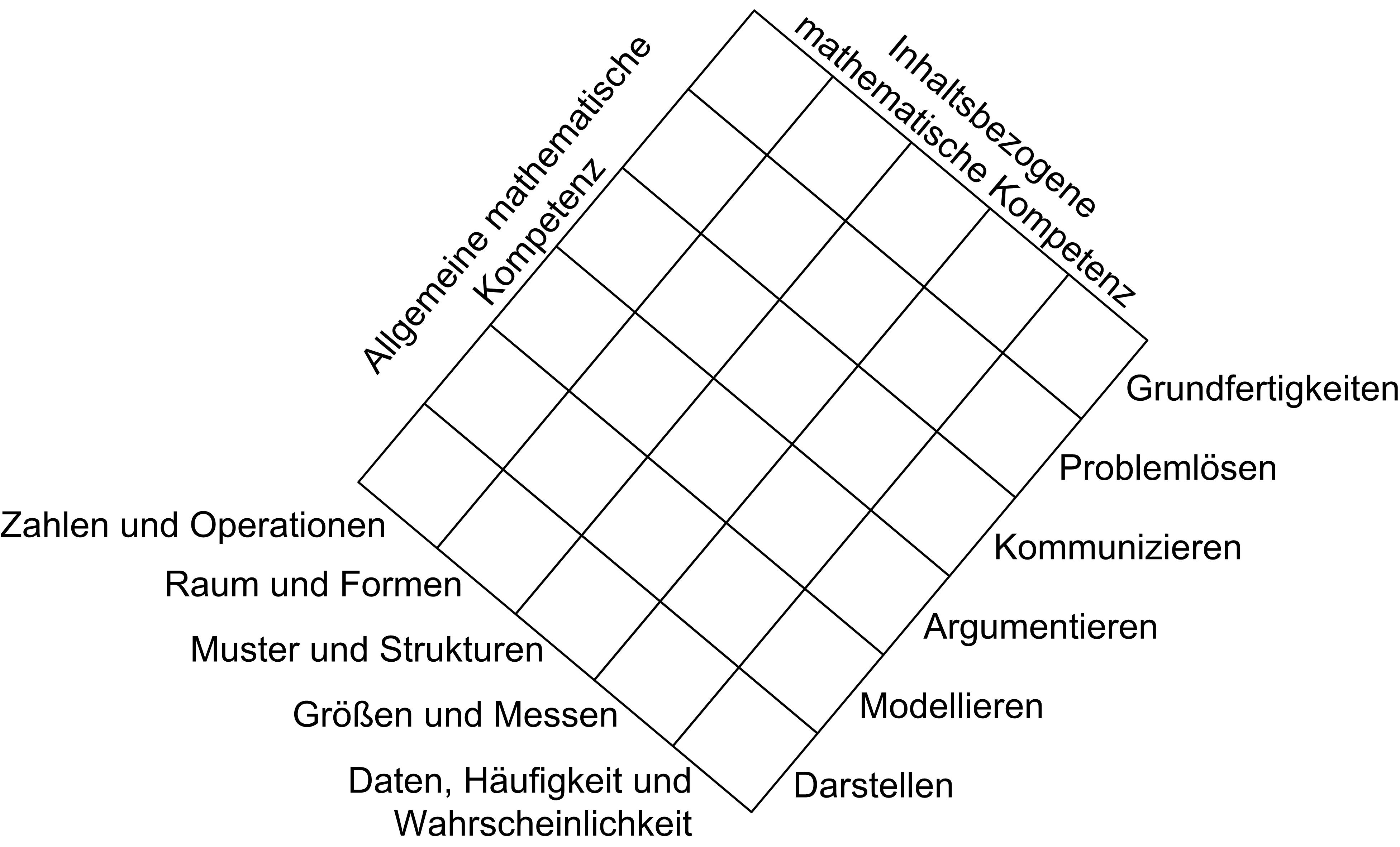 In den Bildungsstandards für das Fach Mathematik im Primarbereich werden sechs allgemeine Kompetenzen (Prozesse) und fünf inhaltsbezogene Kompetenzen (Leitideen) unterschieden, die in der folgenden Abbildung aufgeführt sind. Mit den vom IQB entwickelten Testaufgaben können die von den Schülerinnen und Schülern erreichten Kompetenzen in den fünf inhaltsbezogenen Kompetenzbereichen (Zahlen und Operationen; Raum und Form; Muster und Strukturen; Größen und Messen; Daten, Häufigkeit und Wahrscheinlichkeit) differenziert erfasst werden. Ferner ist es möglich, auf einer Globalskala abzubilden, welches Kompetenzniveau die Schülerinnen und Schüler im Fach Mathematik insgesamt erreicht haben.